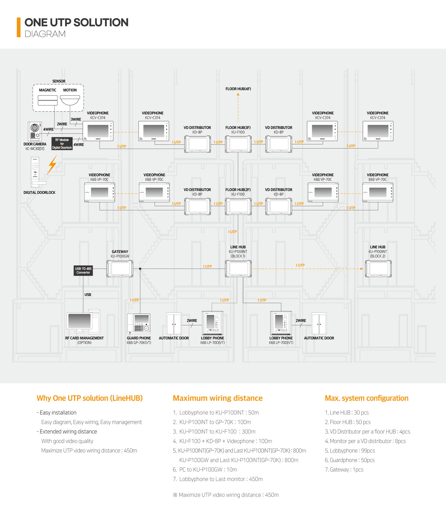 | Wiring | System line : 8 lines (polarity) Lobby video : 2 wire (UTP/Coaxial) Door camera : 4 wire |